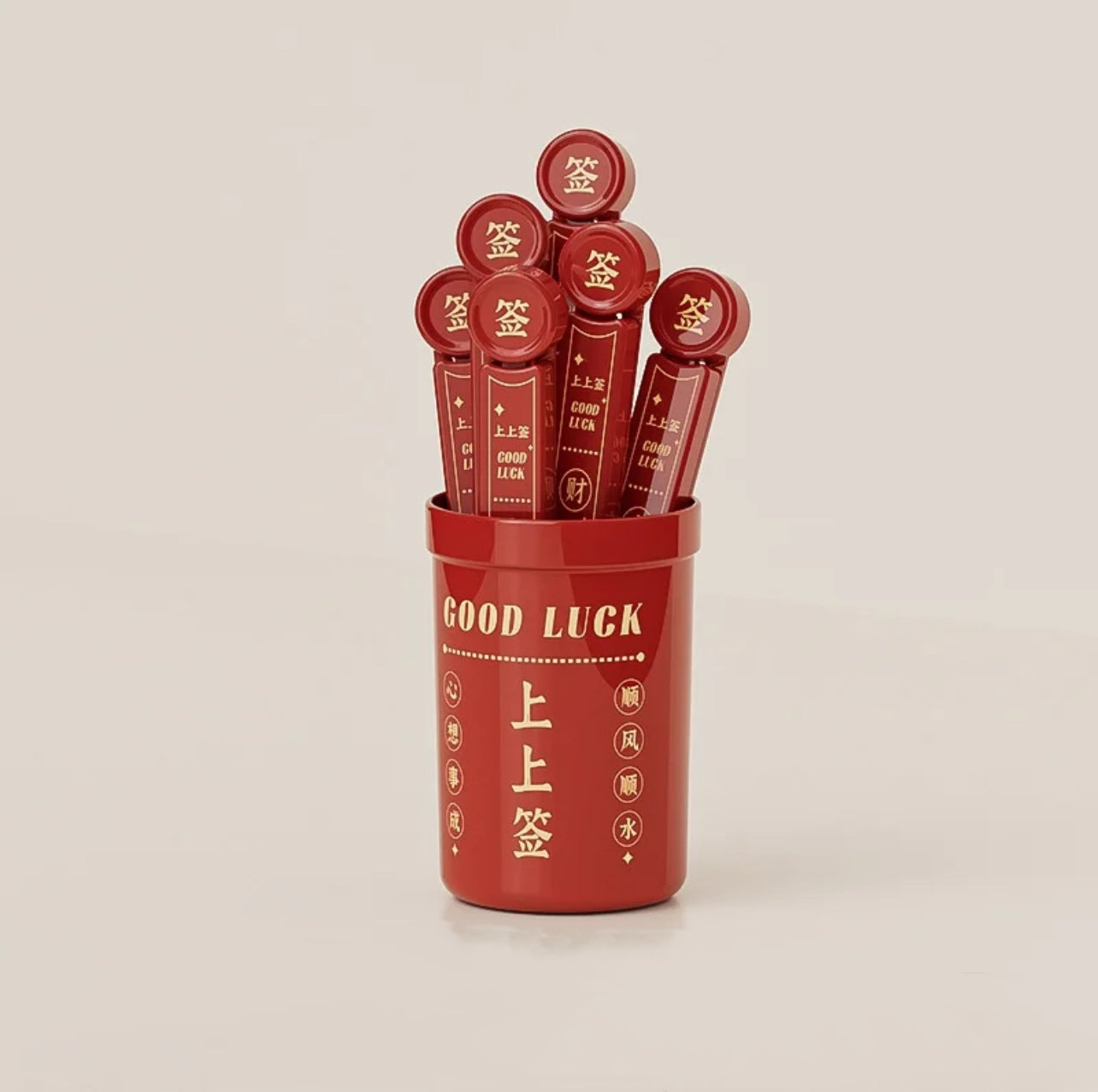 Discover the magic of ancient Chinese fortune-telling with this Good Luck Fortune Clips Set. The set features a beautifully crafted red container adorned with golden inscriptions of good fortune, filled with meticulously designed sticks that symbolize prosperity and wisdom. Perfect for bringing positive energy into your home, this set is both a conversation starter and a meaningful decor piece. Simply shake the container, let fate choose your clips, and uncover your fortune. A delightful addition to celebrations, special occasions, and daily reflection.